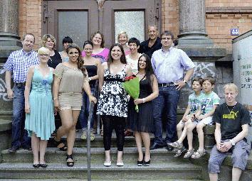 Auf dem Foto sind zu sehen: Oleg Dratschev, Miguel Gubba, Stanislav Heckmann, Bianca Neumann, René Prell, Julian Überall, Lieselotte Berthold, die Deutschlehrerin Birgit Börsting und Ulrike Eichholz.
