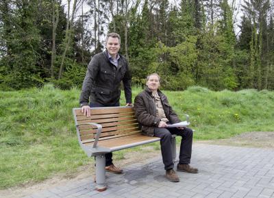Stadtbaurat Mike-Sebastian Janke (l.) und Volker Lauterbach von der Abteilung Stadterneuerung und Freiraumplanung an einem der neuen, zusätzlichen Standorte für Ruhebänke am Fuß- und Radweg auf der alten Bahntrasse.