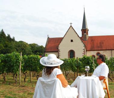Titelmotiv der aktuellen Broschüre: Im Rahmen der Aktion „Kirche am Weg“ finden auch im Jahr 2015 zahlreiche Gottesdienste an besonderen Orten in der Ferienlandschaft „Liebliches Taubertal“ statt. Foto: Tourismusverband „Liebliches Taubertal“, Peter Frischmuth