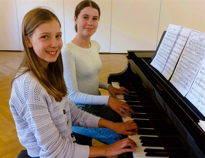 Das Klavierduo Sophie Reiner und Noemi Kunkel bereitet sich auf das Sommerkonzert der Musikschule vor. Foto: Musikschule Wertheim