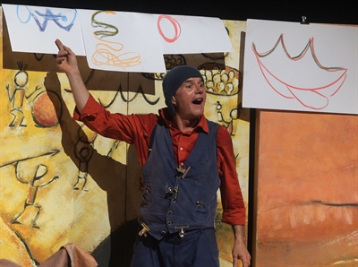 Das Kindertheater Tom Teuer spielt auf Einladung der Stadtbücherei das Stück“ Wie die Buchstaben entstanden.“ Foto: Theater Tom Teuer