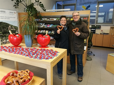 Das Tourismus-Team um Donia Dridi (rechts) und Mareike Suhl verteilt am Valentinstag Herzen an die Gäste. Foto: Tourismus Wertheim