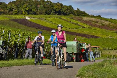 Weingenussradler in Röttingen an der Weinstraße Taubertal: Die Ferienlandschaft „Liebliches Taubertal“ ist für das Jahr 2016 bestens gerüstet. Neben den Jahresangeboten kann aus über 1.000 Veranstaltungen ausgewählt werden. Foto: „TLT/Peter Frischmuth