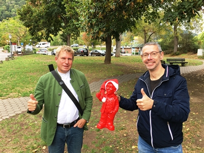 Weihnachtsmärkte sind ein hoffnungsfrohes und ein optimistisches Signal, sind sich Bernd Maack (links) und Christian Schlager einig. Dazu passt der Wertheimer Optimist. Foto: Stadt Wertheim
