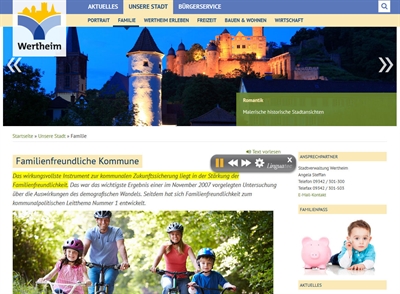 Bildschirmaufnahme der Wertheimer Homepage mit der neuen Vorlesefunktion. Ab sofort können alle textlastigen Seiten vorgelesen werden.