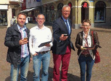Über freies Surfen im Internet freuen sich (von links): Stefan Kempf vom Verein Stadtmarketing, Innenstadtmanager Christian Schlager, Oberbürgermeister Stefan Mikulicz und Büchereileiterin Michaela Stock. Foto: Birger Daniel-Grein