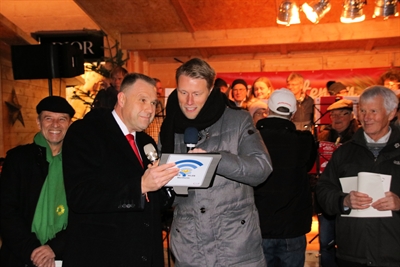 Per Knopfdruck schalteten Oberbürgermeister Markus Herrera Torrez und Stadtwerke-Geschäftsführer Thomas Beier am Samstag das City-WLAN frei. Foto: Stadt Wertheim