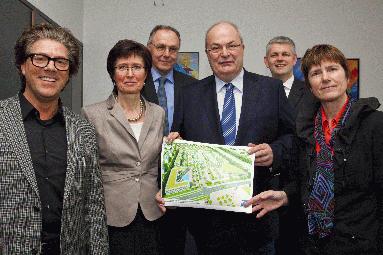 Die Pläne für das Gelände der ehemaligen Paracelsus-Kaserne wurden gemeinsam vorgestellt von den Architekten Frank Degener und Dr. Ulrike Hesse, Oberbürgermeister Thomas Hunsteger-Petermann und HSHL-Vizepräsident Karl-Heinz Sandknop.