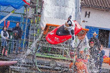Eine fliegende Kuh und andere mutige Luftakrobaten waren bei der ersten inoffiziellen Kanu-Freestyle Big Air Weltmeisterschaft am Datteln-Hamm Kanal zu bestaunen. (Foto: Thorsten Hübner)