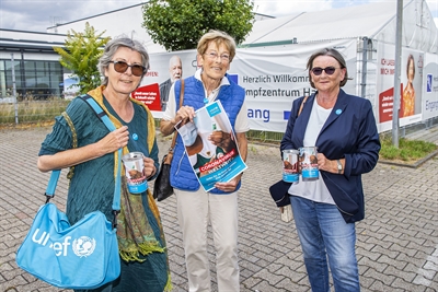 Elke Bumiller-Krause, Mathilde Hense und Ingrid Supe (v.l.n.r.) von der UNICEF Arbeitsgruppe Hamm stellten die Spendenaktion am Impfzentrum an der Friedensschule vor.