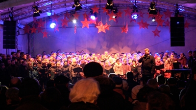 Vom Rathaus komme ich her; Ich muß euch sagen, es weihnachtet sehr! Pünktlich zur Adventszeit wurde vor dem Rathaus am Theodor-Heuss-Platz ein stattlicher Weihnachtsbaum aufgestellt. Foto: Thorsten Hübner