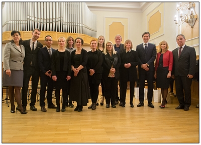 v.l.: Maria Pawelec (Leiterin der Musikschule Kalisz), Philipp Marquardt, Mateusz Podsadny (stellv. Bürgermeister), Mila Kreienfeld, Aaron Nachtigall, Birgit Eckel, Tanja Prill, Inken Grefer, Milena Anitoniewicz, Uwe Sauerland, Dagmar Smalla, Stadtpräsident Krystian Kinastowski, Kulturdezernentin Grazyna Dziedziak und Bildungsdezernent Mariusz Witczak.