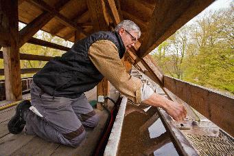 In luftiger Höhe im Gradierwerk reinigte Jörg Sievers Abläufe und Wasserhähne.