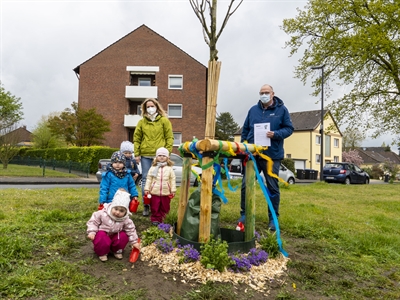 Am Holunderweg informierte Heribert Plattfaut, Einsatzleiter Grünflächenunterhaltung bei der Stadt Hamm, Kerstin Sickler und die Kinder aus ihrer Tagespflege über ihre neue Baumpatenschaft.