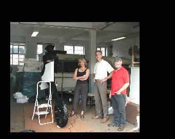 Helga Kock am Brink, Stadtbaurat Ulrich Paßlick und Metallkonstrukteur Strobos in der Werkstatt der Künstlerin