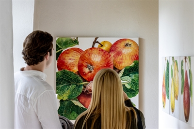 Im Rahmen ihrer Führung stellte Sara Dietrich (l.), Kuratorin und Leiterin des DA, während der Finissage das Konzept der Ausstellung „BIOPHILIA. Von Pflanzen und Menschen“ und die einzelnen Werke noch einmal näher vor.