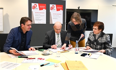 Freuen sich über den Förderbescheid und hoffen auf den Energie-Oskar: Energieteamleiter Andreas Bennemann (v.l.), Reiner Tippkötter von der Firma infas enermetric aus Emsdetten, Landrat Thomas Kubendorff und Baudezernent Franz Niederau.