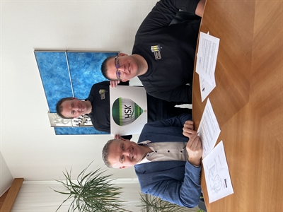 Unterzeichneten den Sponsorenvertrag für den Heißluftballon: Landrat Thomas Grosche (l.) und Dominik Pfeiffer (r.) als 1. Vorsitzender des Warsteiner Happy Ballooning e.V. im Beisein von Nico Kemper (m.), technischer Leiter der WHB.