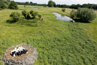 Das Storchenpärchen hat Junge bekommen: Schon aus der Distanz kann man erahnen, was in der Nisthilfe an der Clörather Mühle zurzeit los ist. Foto: Axel Küppers / Abdruck honorarfrei