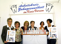 Der Arbeitskreis Zahngesundheit im Kreis Viersen: Claudia Kümmel, Gudrun Simon, Zahnärztin und Leiterin des Arbeitskreises, Susanne Rosemann, Birgit Verhülsdonk, Waltraud Czudnochowski, Bettina Huiybregts (von links) präsentieren die neuen Zahnrettungsboxen. Foto: Horst Siemes/Kreis Viersen - Abdruck honorarfrei