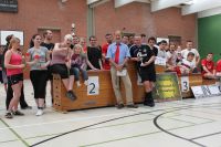 Kreis Viersen, Kreissportbund und Sparkasse Krefeld / Kreis Viersen ehren die erfolgreichen Absolventen von Sport- und Laufabzeichen. Kreis-Jugenddezernent Ingo Schabrich, Franz Terlinden von der Marketingabteilung der Sparkasse, sowie Kreissportbund-Vorsitzender Kurt Heinrich (vorne v.r.) gratulieren den sportlichen Schülern. Foto: Benedikt Giesbers / Abdruck honorarfrei