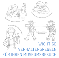 Die beliebten illustrierten Figuren aus dem museumspädagogischen Programm erklären den Besuchern die Hygienerichtlinien. Grafik: Kreis Viersen