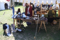 Die Schausteller der Bergischen Lehnsritter pflegen die Waffen, arbeiten an Körben und zeigen ihre Tongefäße. Die Gruppe aus Troisdorf zeigt den Besuchern des Mittelaltermarkts im Niederrheinischen Freilichtmuseum das historische Lagerleben. Foto: Niederrheinisches Freilichtmuseum / Abdruck honorarfrei