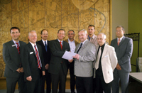 Landrat Peter Ottmann (4. von links) gratuliert Ralf Seebauer, Jürgen Verhoeven, Werner Graf, Thomas Turinsky, Georg Schweikert, Roland Jansen, Roland Schlegel und Bernd Keiluweit (von links) Foto: Horst Siemes/Kreis Viersen - Abdruck honorarfrei