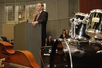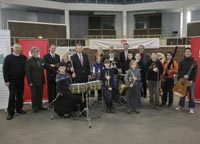 Probenbesuch: Kreisdirektor Dr. Andreas Coenen (2. v.l.) begrüßt die Musiker in Viersen. Maria Baptist (3. v.l.), Ralf Holtschneider (l.) mit dem Percussion-Ensemble Splash sowie das Bundesjugend-Jazzorchester BuJazzo mit dem Projektleiter Dr. Peter Ortmann (4. v.l.) proben in der Kreismusikschule Viersen für den Auftritt beim Jazzfestival. Foto: Horst Siemes / Abdruck honorarfrei