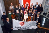 Nachwuchsmusiker aus dem Kreis Viersen und aus Mönchengladbach zeigen bei "Jugend musiziert" wieder ihr Können. Schirmherr Landrat Peter Ottmann (4. von links), Ralf Holtschneider, Regionalausschussvorsitzender "Jugend musiziert" (3. von links), und Bernhard Kloeters, Leiter der Kreismusikschule Viersen (2. von links), freuen sich mit den Sponsoren und den Musikern auf den Wettbewerb im Forum des Kreishauses. Foto: Alois Müller/Kreis Viersen - Abdruck honorarfrei