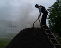 Der rauchende Holzkohlemeiler vor der Dorenburg im Niederrheinischen Freilichtmuseum. Die Aufnahme entstand beim letzten Besuch der Köhlerei Reichswalde vor zwei Jahren. Foto: Niederrheinisches Freilichtmuseum / Abdruck honorarfrei