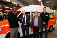Cedric Philippe Obiombok (v.l.) nimmt den Schlüssel von Ordnungsdezernent Thomas Heil entgegen. Michael Benecke und Michael Loeper von der Abteilung Bevölkerungsschutz freuen sich, dass der stillgelegte Krankenwagen eine neue Aufgabe gefunden hat.