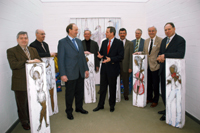 Landrat Peter Ottmann (rechts) und Ludger Gooßens, Vorstandsvorsitzender und Stiftungsvorstand der Sparkasse Krefeld (links) mit den Preisträgern des Kunstpreises 2009 Ulrike Anna Bleier, Marie Therese Martin und Oleg Zhukov (von rechts) sowie der Jury mit dem Viersener Schriftsteller Markus Orths, FAZ-Redakteur Jochen Hieber und Wolfgang Schiffer, Leiter der Programmgruppe Hörspiel und Feature von WDR 3 (hintere Reihe von links). Foto: Alois Müller-Kreis Viersen/Abdruck honorarfrei