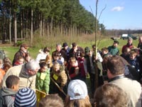 67 deutsche und niederländische Grundschüler pflanzten beim 17. Internationalen Baumpflanztag gemeinsam im Meinweggebiet rund 1.500 Bäume. Begrüßt wurden sie auch vom Vorsitzenden der Verbandsversammlung des Naturparks Schwalm-Nette Dr. Ferdinand Schmitz (links). Foto: Alois Müller/Kreis Viersen - Abdruck honorarfrei