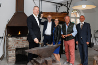 Sind begeistert von der renovierten Schmiede: Landrat Dr. Andreas Coenen, Kreisdirektor und Kulturdezernent Ingo Schabrich, Museumsleiterin Anke Wielebski, Fördervereins-Vorsitzender Herbert Kettner und Marco Jütten von der Sparkasse Krefeld. Foto: Kreis Viersen - Abdruck honorarfrei