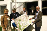 Christa Eicher, Leiterin des Amtes für Bauen, Landschaft und Planung, Hans-Josef Kampe, Vertreter der Freizeitreiter für den Pferdesportverband Rheinland e.V. , Landrat Peter Ottmann sowie Dezernent Hartmut Kropp (von links) präsentieren die neue Reitwegekarte für den Kreis Viersen. Foto: Horst Siemes - Kreis Viersen/Abdruck honorarfrei