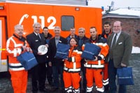 Kreisbrandmeister Klaus-Thomas Riedel (2. von links) überreichte einen Florianteller als Glücksbringer an die Mitarbeiter der Rettungswache Niederkrüchten-Heyen. Foto: Horst Siemes/Kreis Viersen - Abdruck honorarfrei