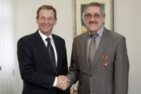 Für sein langjähriges Engagement vor allem im Brand- und Katastrophenschutz erhielt Hermann Snellen aus Tönisvorst (rechts) jetzt von Landrat Peter Ottmann das Bundesverdienstkreuz am Bande. Foto: Alois Müller/Kreis Viersen - Abdruck honorarfrei
