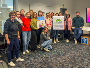 Preisübergabe vom Abfallbetrieb des Kreises Viersen an Gewinner-Schule (v.l.n.r.): Carola Müller (Lehrerin), Daniel Jansen (Bildungsgangleitung), Hans Kettler (Vorsitzender des Fördervereins), Martin Overmeyer (Stellvertretende Betriebsleitung des Abfallbetriebes des Kreises Viersen), Schülerinnen und Schüler des Bildungsgangs Ernährungs- und Versorgungsmanagement und Elke Terbeck (Schulleitung Rhein-Maas Berufskolleg).