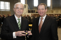 Landrat Dr. Andreas Coenen (rechts) übergibt dem Bürgermeister der Stadt Kempen Christoph Dellmans (links) einen symbolischen Schlüssel