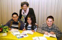 Strahlende Gesichter bei den Siegern des Vorlesewettbewerbs: Redwan El Bouazzati, Sanja Lehmann und Fabian Eultgen ( von links) freuten sich mit Schulamtsdirektorin Rosemarie Voßen über ihre Preise. Foto: Horst Siemes/Kreis Viersen - Abdruck honorarfrei