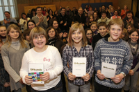 Teilnehmer und Publikum des Vorlesewettbewerbs - im Vordergrund die drei glücklichen Gewinner mit ihren Urkunden: Miriam Fasen, Michèle Lisa Klocke und Heiko Ludwig (von links). Foto: Alois Müller - Abdruck honorarfrei
