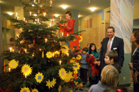Adventliches Treiben im Foyer des Kreishauses: Landrat Peter Ottmann und die Schüler der Gereonschule des Kreises Viersen schmücken den Weihnachtsbaum mit Selbstgebasteltem. Foto: Kreis Viersen/Abdruck honorarfrei