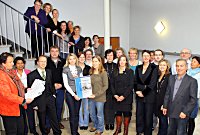 Ingrid Pieper-Sentürk, stellvertretende Verbandsdirektorin des Landesverbandes der Volkshochschulen von Nordrhein-Westfalen (l.) überreicht die Zertifikate an die Dozentinnen und Dozenten. René Penke VHS-Fachbereichsleiter (3. v.l.) und Trainer Dieter Giesewski (4. v.l.) freuten sich mit den Teilnehmern. Foto: Kreis Viersen / Abdruck honorarfrei