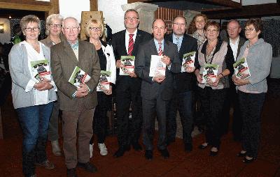 Landrat Thomas Kubendorff (Mitte) und Reinhild Finke (rechts), Vorsitzende des Kreisheimatbundes, präsentierten am vergangenen Dienstag gemeinsam mit Projektverantwortlichen und Mitarbeitern das Jahrbuch „UNSER KREIS 2015“ im Haus Hehwerth in Lotte. Foto: Bergau/Kreis Steinfurt