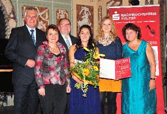 2012 wurde zum ersten Mal der „Sparkassen Nachwuchspreis – Meister von Morgen“ verliehen. Er ging an die Sängerin Anna-Doris Capitelli aus Ibbenbüren (3.v.r.) und die Malerin Julia Drahmann aus Steinfurt (2.v.r.). Es gratulierten: Heinz-Bernd Buss, Vorstandsmitglied der Kreissparkasse Steinfurt (l.), Sabine Ritterbusch, Professorin für Gesang an der Hochschule für Musik, Theater und Medien aus Hannover (2.v.l.), der stellvertretende Landrat Bernhard Hembrock (3.v.l.) und Annegret Rose, Kunstkritikerin aus Steinfurt (r.).