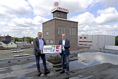 Landrat Dr. Martin Sommer und der Werksleiter der Rolinck-Brauerei in Steinfurt Marcel ter Steege präsentieren das Logo zum 75. Geburtstag des Landes NRW, das eine Woche lang den Brauereiturm erstrahlt.