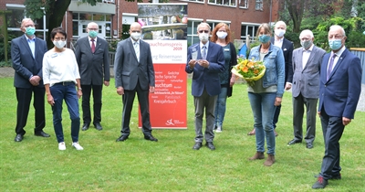 Im Beisein seiner Familie und Freunde nahm Georg Reinermann (Mitte) den Brauchtumspreis des Kreises Steinfurt 2019 vom kommissarischen Behördenleiter der Kreisverwaltung, Kreisdirektor Dr. Martin Sommer (4. v. l.) , im Garten des St. Josef Stift entgegen.