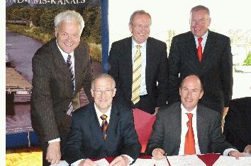 Regionale Zusammenarbeit macht offenbar Spaß: Landrat Thomas Kubendorff bei der Vertragsunterzeichnung. Dahinter Landrat Hermann Bröring (stehend Mitte) und Dr. Hermann Kues, Parlamentarischer Staatssekretär (stehend l.).