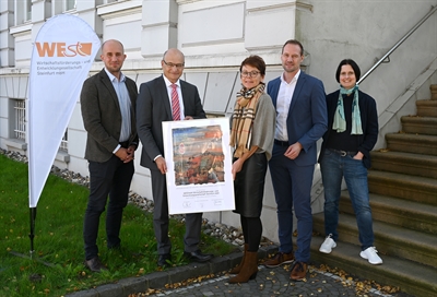 Christian Rapien, WESt (2.v.l.), und Prof. Christof Wetter, FH Münster (3.v.l.), überreichen den Wärmegutschein in Höhe von 13.700 € an die Vertreter der Stadt Rheine (v.l.): Mark Dieckmann (Prozesskoordination „Eschendorfer Aue“), Guido Wermers (Umwelt und Klimaschutz) und Martin Dörtelmann (Stadtplanung).